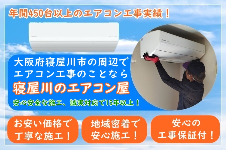 寝屋川のエアコン屋は家庭用のエアコン工事を主にエアコン取り付け・取り外し工事をおこなっている地域密着のエアコン業者で、寝屋川市を中心に大阪府で活動しております。